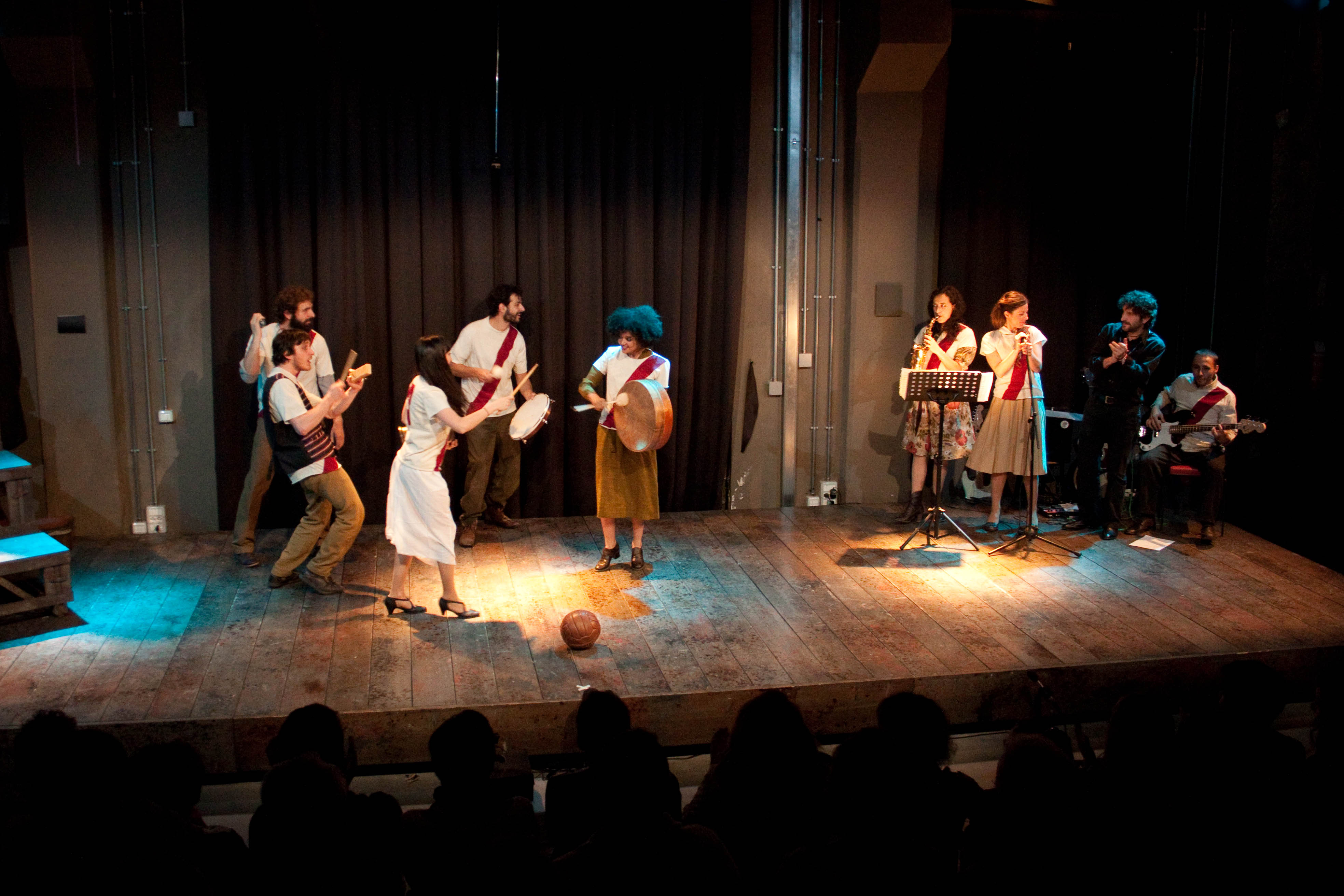 Succede così con la musica di SPORTING: si pesca dal mucchio degli attori et voilà, ecco uscire una sassofonista, Giulia Filippone, studi al Conservatorio, un bassista, Samuel Fuscà e una cantante, Manuela Grippi, autrice del testo della “Canzone di Leticia”. Come se non bastasse, Maurizio, oltre a comporre tutte le partiture, coinvolge in un percorso ritmico tutti gli altri attori, che daranno vita, in un crescendo entusiasmante, fra tifo e festa, alla fase conclusiva dello spettacolo (da vedere!).